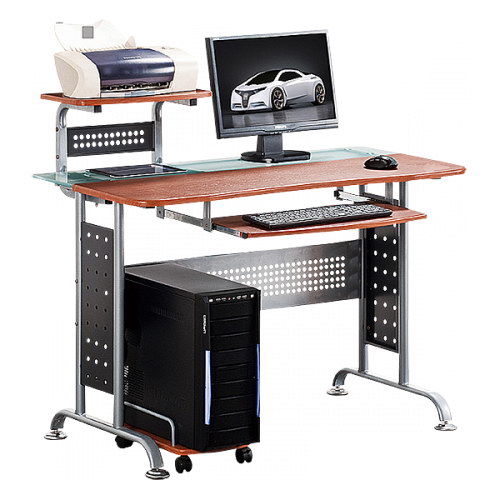 Конструкция стола включает столешницу, выполненную из МДФ, а также дополнительную полку под принтер или другое офисное оборудование, расположенную над столешницей на металлических ножках. Также компьютерный стол данной модели включает в себя выдвижную полочку для размещения клавиатуры и отдельную полку под системный блок, оснащенную колесиками для удобного размещения блока под столом или сбоку от него.