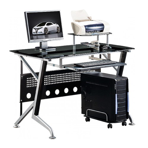 Конструкция стола включает основную столешницу из прочного стекла, отлично сопротивляющегося царапинам и прочим повреждениям, выдвижную полку для клавиатуры и специальную полочку для принтера, которая возвышается над столешницей на трех металлических трубках-ножках. Кроме того, к столу прилагается специальная конструкция под системный блок, оснащенная колесиками и с защитными ручками, препятствующими опрокидыванию блока.