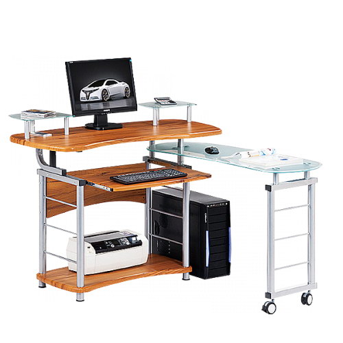 Конструкция включает две столешницы – одна из них выполнена из МДФ теплого цвета - дерево, покрытое лаком, и предназначена для установки монитора. Вторая столешница располагается сбоку, под прямым углом. Овальная стеклянная поверхность на металлических ножках, оснащенных колесиками для удобства транспортировки стола. На этой столешнице можно удобно разместить необходимые бумаги и все, что может понадобиться в процессе работы.