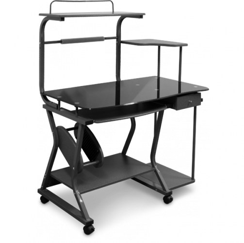 Компьютерный стол включает в себя стеклянную столешницу под монитор, две полочки, расположенные над столешницей - под принтер, факс или другое оборудование, а также нижнее отделение для системного блока и широкую полку для любых приспособлений, книг или бумаг. Если вы поместите канцелярские принадлежности в выдвижной шкафчик, они всегда будут под рукой в нужное время, а специальное отделение для дисков исключит потерю или порчу данных предметов.