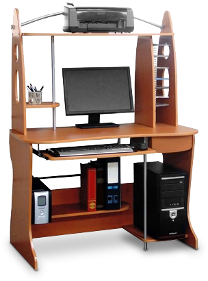 Компьютерный стол изготовлен из ламинированного МДФ светлой расцветки с добавлением металлических деталей. Конструкция включает просторную столешницу для монитора, отделение для дисков, расположенное с правого края стола, а также две полочки над столом и отделение под системный блок, расположенное в самом низу. Кроме того, стол оборудован еще одной полкой, расположенной под основной столешницей и выдвижным устройством для размещения клавиатуры.